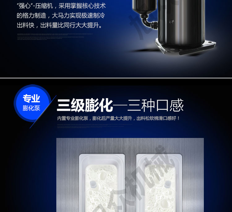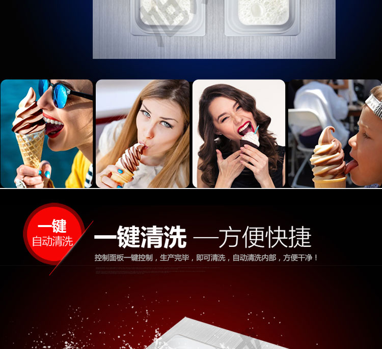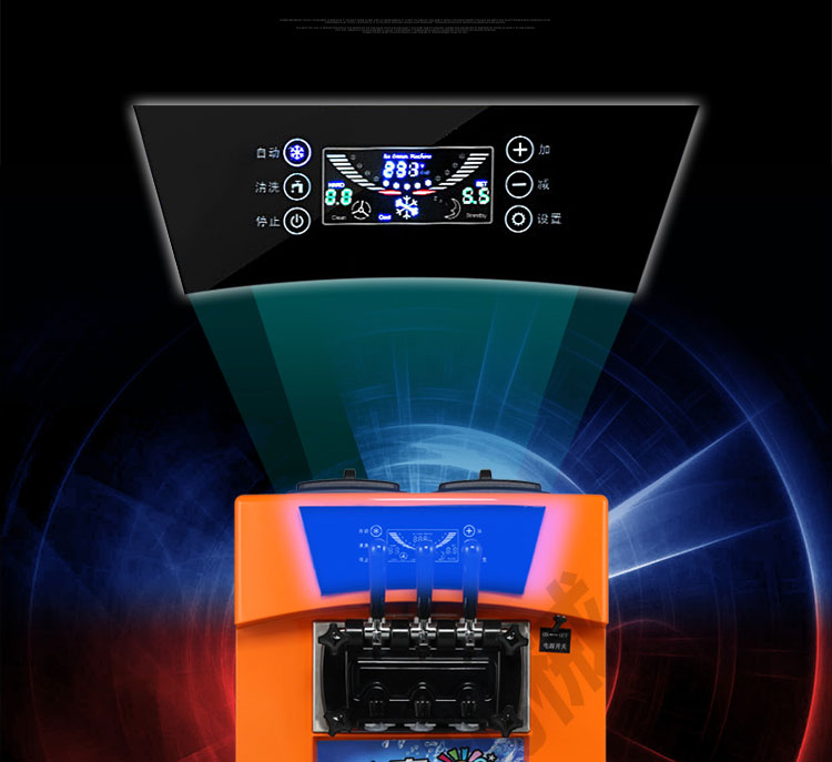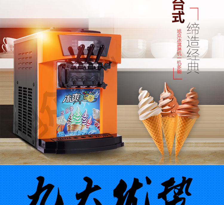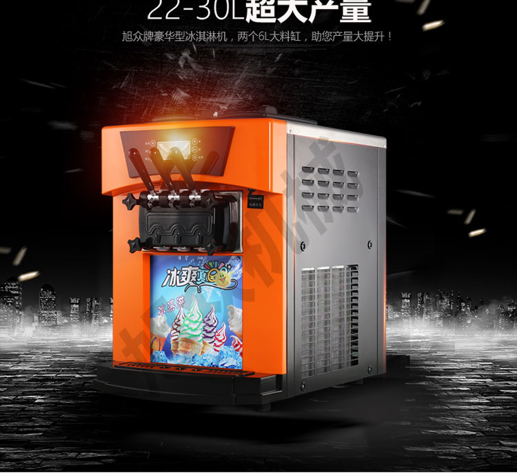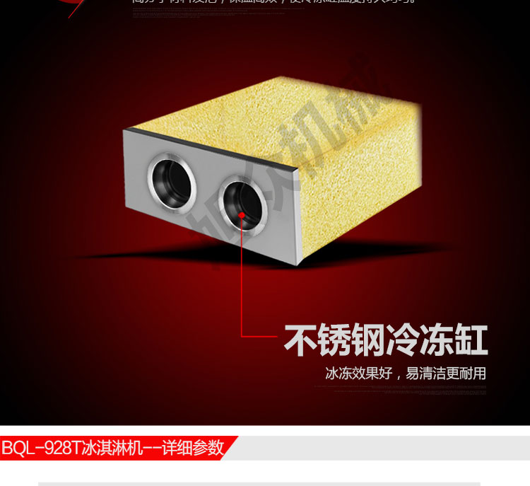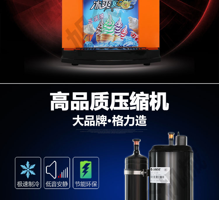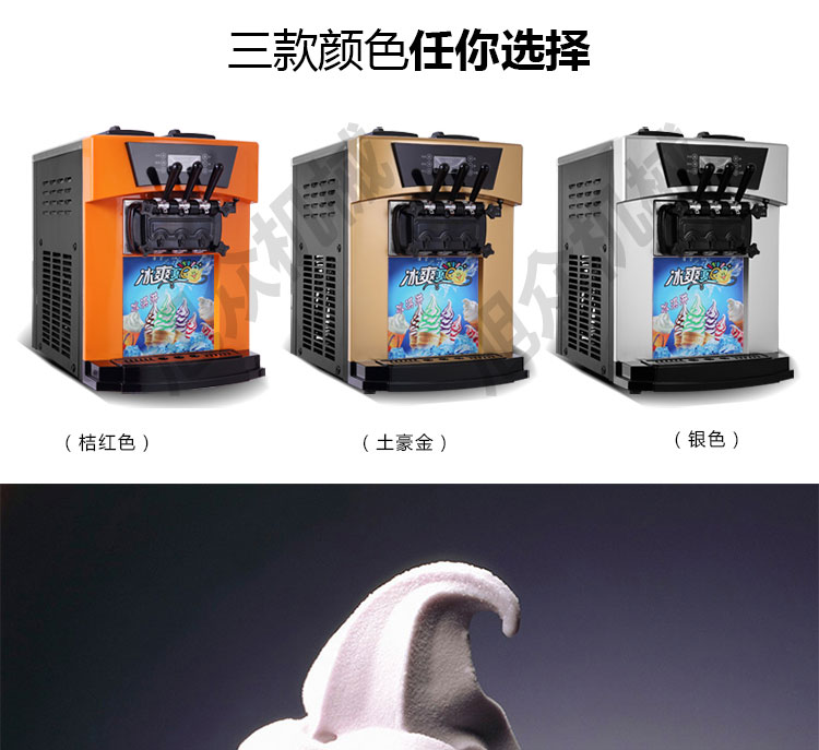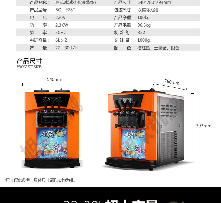 名稱BQL-928T冰淇淋機 電源220V 功率2.3kw 產量20-30L/h 尺寸540×780×793mm 重量96.5kg 規格 其他顏色:銀色,桔色,土豪金