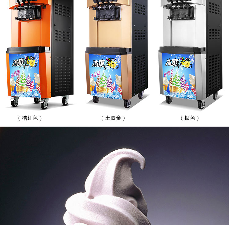 名稱BQL-928冰淇淋機 電源220V 功率2.3kw 產量20-30L/h 尺寸540×676×1360mm 重量118kg 規格 其他顏色:銀色,桔色,土豪金