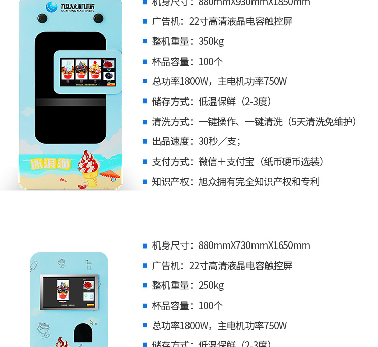 名稱XZ-QZD-01自動售賣冰淇淋機 電源 功率1.8kw 產量 尺寸880×930×1850mm 重量350kg 規格 其他