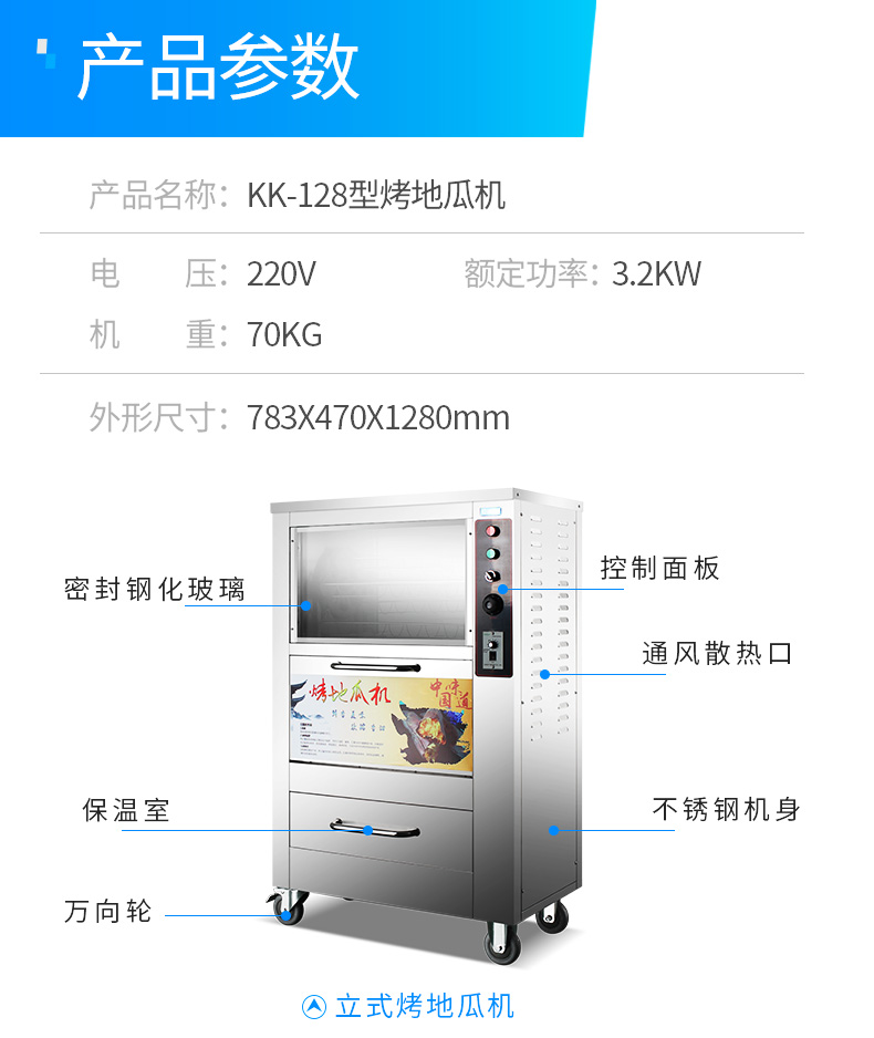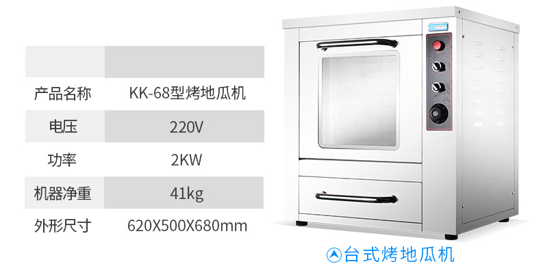 名稱KK-128烤地瓜機 電源220V 功率3.2kw 產量 尺寸783×470×1280mm 重量70kg 規格 其他