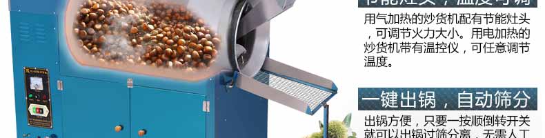 3.用氣加熱的炒貨機配有節能灶頭,可調節火力大小。用電加熱的炒貨機帶有溫控儀,可任意調節溫度。