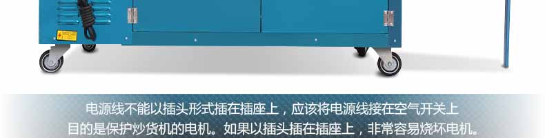 電源線不能以插頭形式插在插座上,應該將電源線接在空氣開關上,目的是保護炒貨機的電機。如果以插頭插在插座上,非常容易燒壞電機。