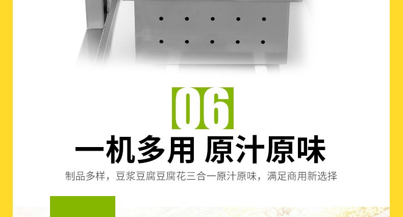 全自動豆腐機系列,一機多用:可生產(chǎn)豆腐系列產(chǎn)品:單色(嫩,老)豆腐、多彩豆 腐、單色豆腐皮、多色豆腐皮、彩色豆腐干、豆?jié){、豆花等豆制品制作,還可以與其他設備和工藝配套生 產(chǎn)更多的豆制品。