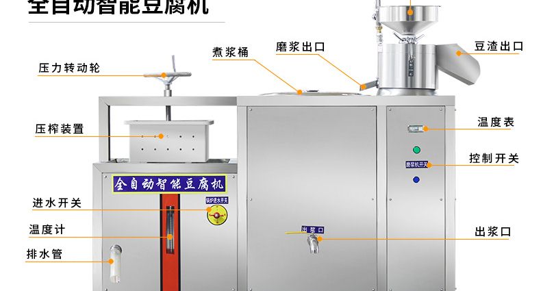 旭眾智能豆腐機專業(yè)生產(chǎn)數(shù)種豆?jié){制品,穩(wěn)定高效,采用磨漿分離機和煮漿機,出品率高于其它設備,擁有自動控制系統(tǒng),還增加數(shù)碼溫度控制儀,對煮漿隨時進行監(jiān)控,同時對不同產(chǎn)品所需溫度自行設定,當煮漿達到設定溫度時,具有自動提示及報警功能;整機采用不銹鋼材質制作,質量卓越,占地面積小,安裝簡單,工藝先進,一臺設備只需一人操作,省時、省力、省工。