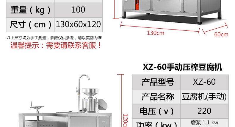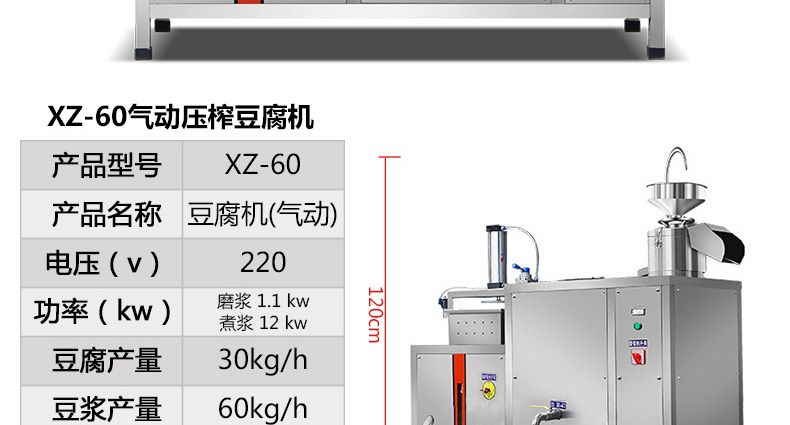 名稱全自動豆腐機系列 電源220V 功率13.1kw 產(chǎn)量豆?jié){產(chǎn)量120斤/h;豆腐產(chǎn)量60斤/h 尺寸600×1300×1200mm 重量 規(guī)格 其他