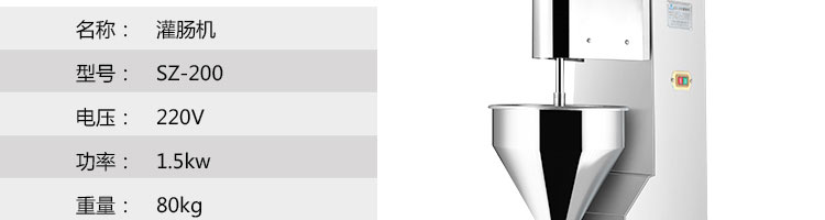 名稱SZ-200灌腸機 電源220/380V(見機器銘牌) 功率1.14-1.5kw 產量200千克/小時 尺寸520*390*1320mm 重量80kg 規格 其他