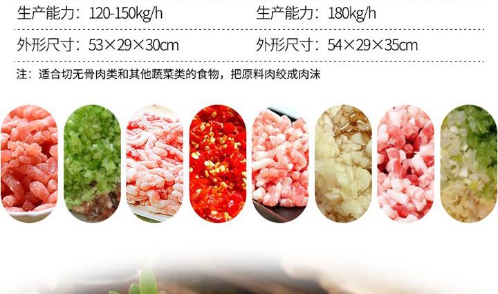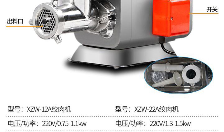 名稱XZW-12A/22A絞肉機 電源220V 功率0.75/1.1kw;1.3/1.5kw 產量120-150kg/h;180kg/h 尺寸53×29×30cm/54×29×35cm 重量23.5kg/25kg 規格 其他