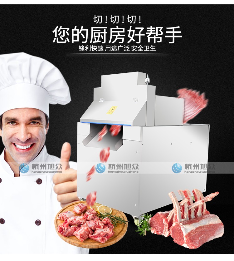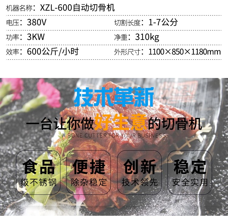XZL-600自動切骨機適用于小型食品加工廠、屠宰場、肉類加工廠、超市等單位使用。適用于中小型動物骨頭,排骨,冷凍肉,凍雞、凍魚、鮮骨頭、鮮肉等加工設備。切骨機接觸食品的部位及外觀部位均采用不銹鋼或耐腐蝕材料制造,符合食品衛(wèi)生要求。本機設計合理,清洗方便,無損耗,采用特殊刀具切骨,不產(chǎn)生碎骨,較大程度保護了您的利益,且全自動送料,操作簡單,大大的減輕工人勞動強度,提高了安全系數(shù)。不易會傷到手,具有效率高,能耗低,操作安全,外形美觀等特點。