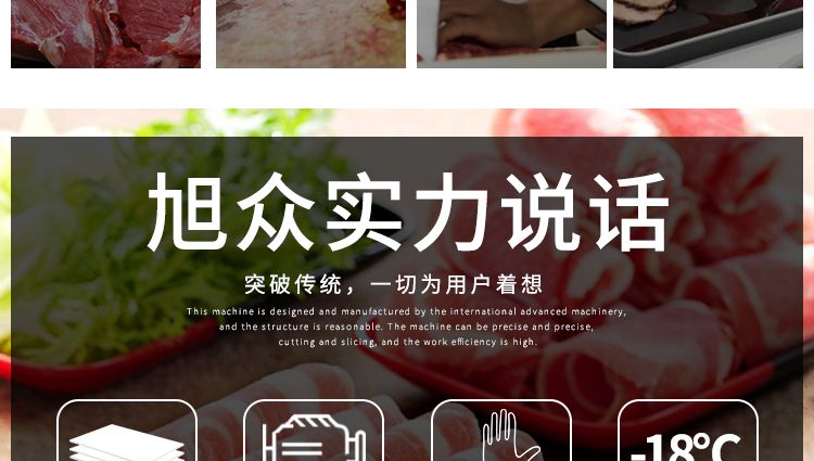 5.旭眾牛羊肉切片機憑借其外觀,高效率加工能力,簡單的操作,及超低的故障率,備受廣大客戶的好評,成型美觀