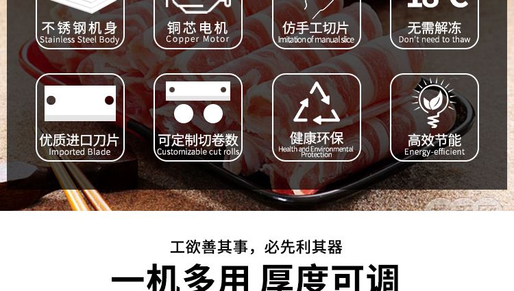 1.不用解凍,-18度的肉卷上機即可切片,肉片不碎且成型美觀