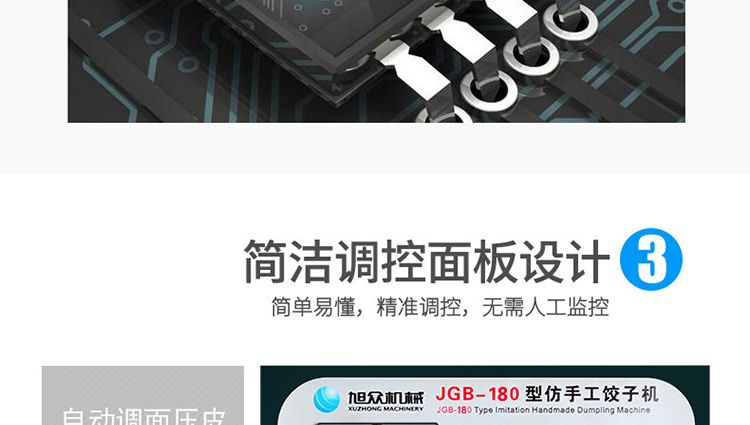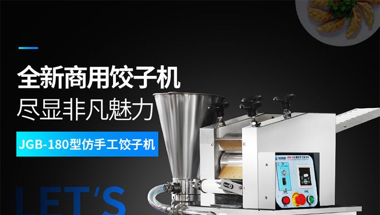 JGB-180仿手工餃子機,先進的自動餃子生產(chǎn)設備,包括主動壓皮部分、自動供餡部分、自動包合部分、自動成品輸送部分,并且只要更換模具,就可制鍋貼等食品。適合食品速凍廠、飯店、廠礦學校食堂等制作包餡面制品單位使用。