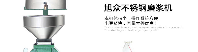 旭眾牌SZ-12/15/20不銹鋼磨漿機結構合理,造型美觀,操作簡便。具有體積小、重量輕、噪音低、省力,性能穩定、質量可靠、容易清洗、移動方便等優點,適用于豆制品廠、飲食服務業、食堂、飯店及個體商戶使用。