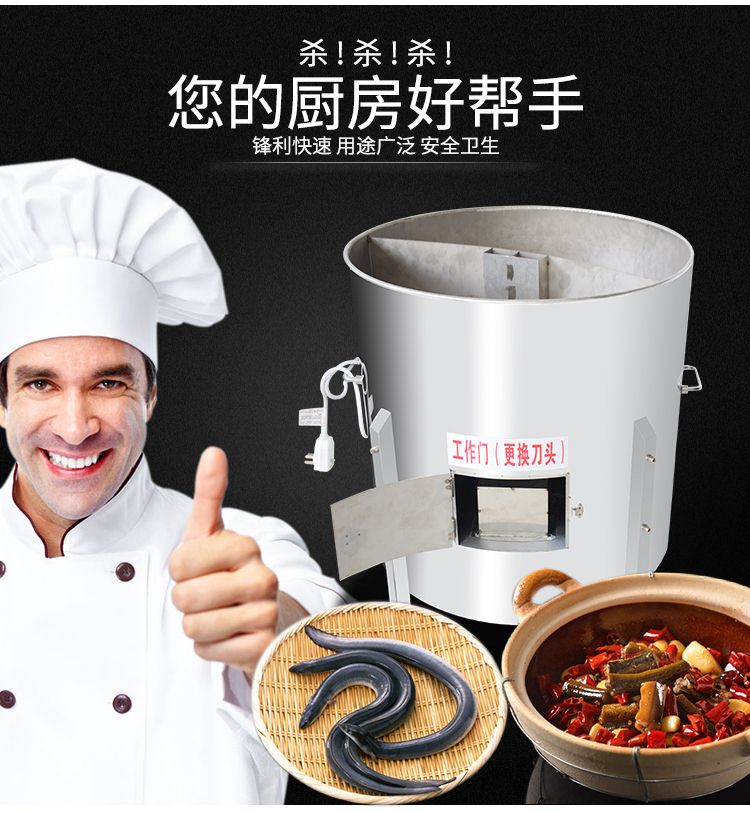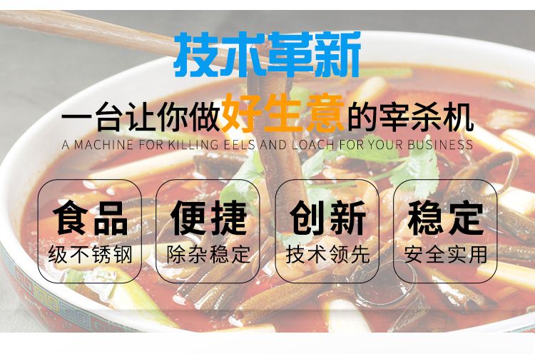 鱔魚泥鰍宰殺機是我廠根據市場需求,自行研發設計的,專業宰殺鱔魚、泥鰍的通用型機電設備,具有工作效率高,能耗低,故障率低,經久耐用,操作安全方便,外形美觀大方等特點。填補了市面上黃鱔泥鰍宰殺設備的空白,是一款不錯的投資產品,可廣泛應用于菜市場、食堂、食品加工廠、酒店等場所。