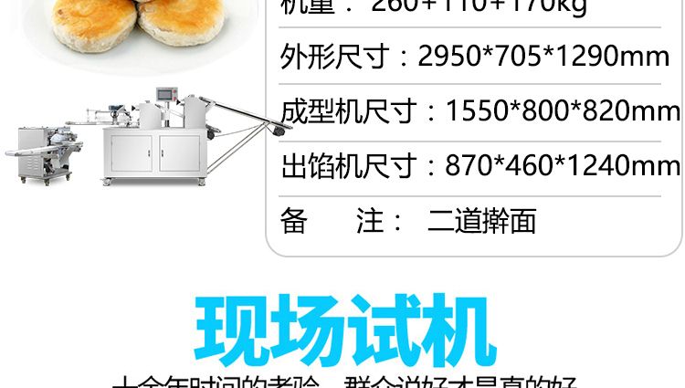 名稱XZ-15B二道搟面酥餅機(jī) 電源220/380V(見機(jī)器名牌) 功率2.5kw 產(chǎn)量0-5000個(gè)/小時(shí) 尺寸2950×705×1290mm 重量260+110+170kg 規(guī)格10-150克/個(gè) 其他