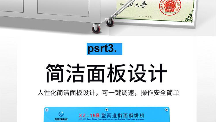 旭眾牌XZ-15B二道搟面酥餅機(jī)是我公司仿手工制作面食產(chǎn)品的機(jī)型,占地面積小,重量輕,它吸收國(guó)內(nèi)傳統(tǒng)手工制作技術(shù),即運(yùn)用搟面杖壓面和打擊面團(tuán),以保證高面筋性和面帶的密度,并綜合考慮面食的口感而研發(fā)。