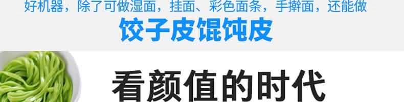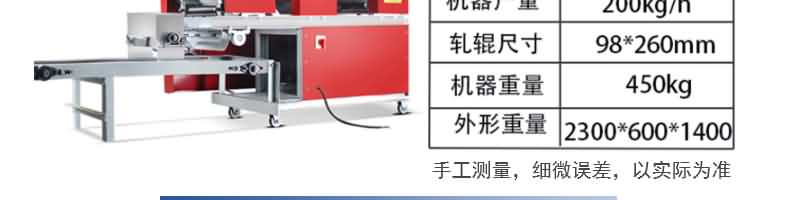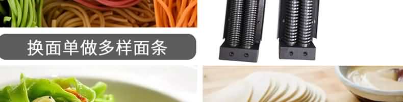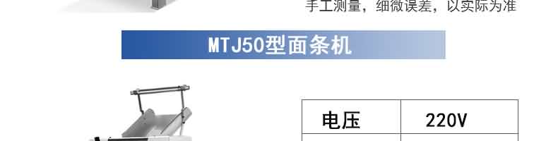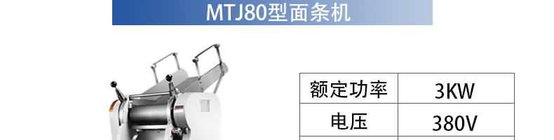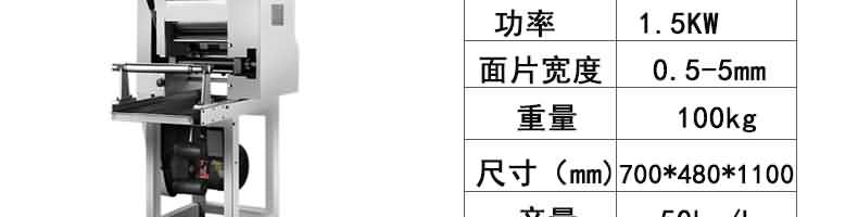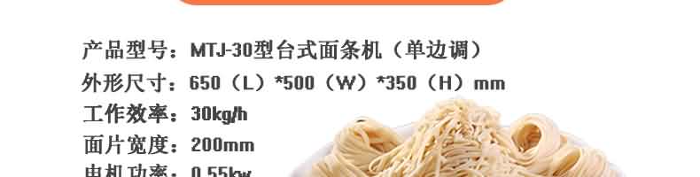 名稱MTJ30臺式面條機 電源 功率0.55kw 產量30kg/h 尺寸650×500×350mm 重量45kg 規格面片寬度200mm面片厚度0.5-4mm 其他