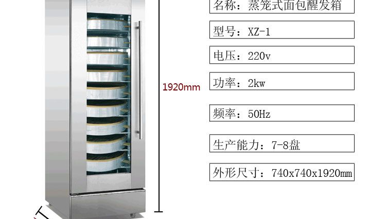名稱蒸籠式面包醒發箱 電源220V 功率2kw 產量7-8盤 尺寸740×740×1920mm 重量 規格 其他