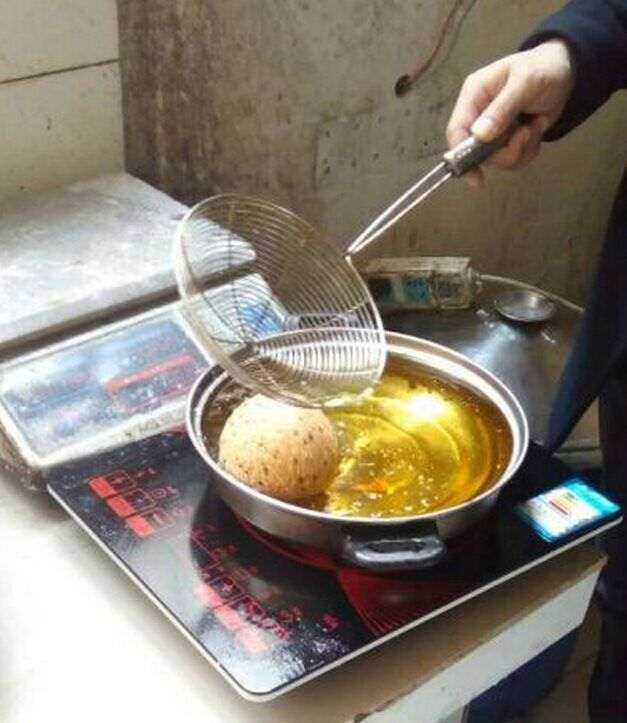 6、鍋中放油燒至五成熱,下入麻球一邊炸一邊翻動以免炸焦。