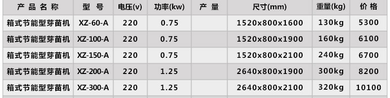 型號(hào)工作電壓耗水量日耗電(度)功率育苗箱重量外形尺寸